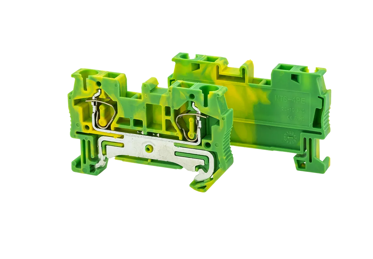 Заземляющие пружинные клеммы MTS-4PE применяются для подключения защитных заземляющих проводников. Клемма фиксируется на DIN-рейке простым защелкиванием без использования инструментов.